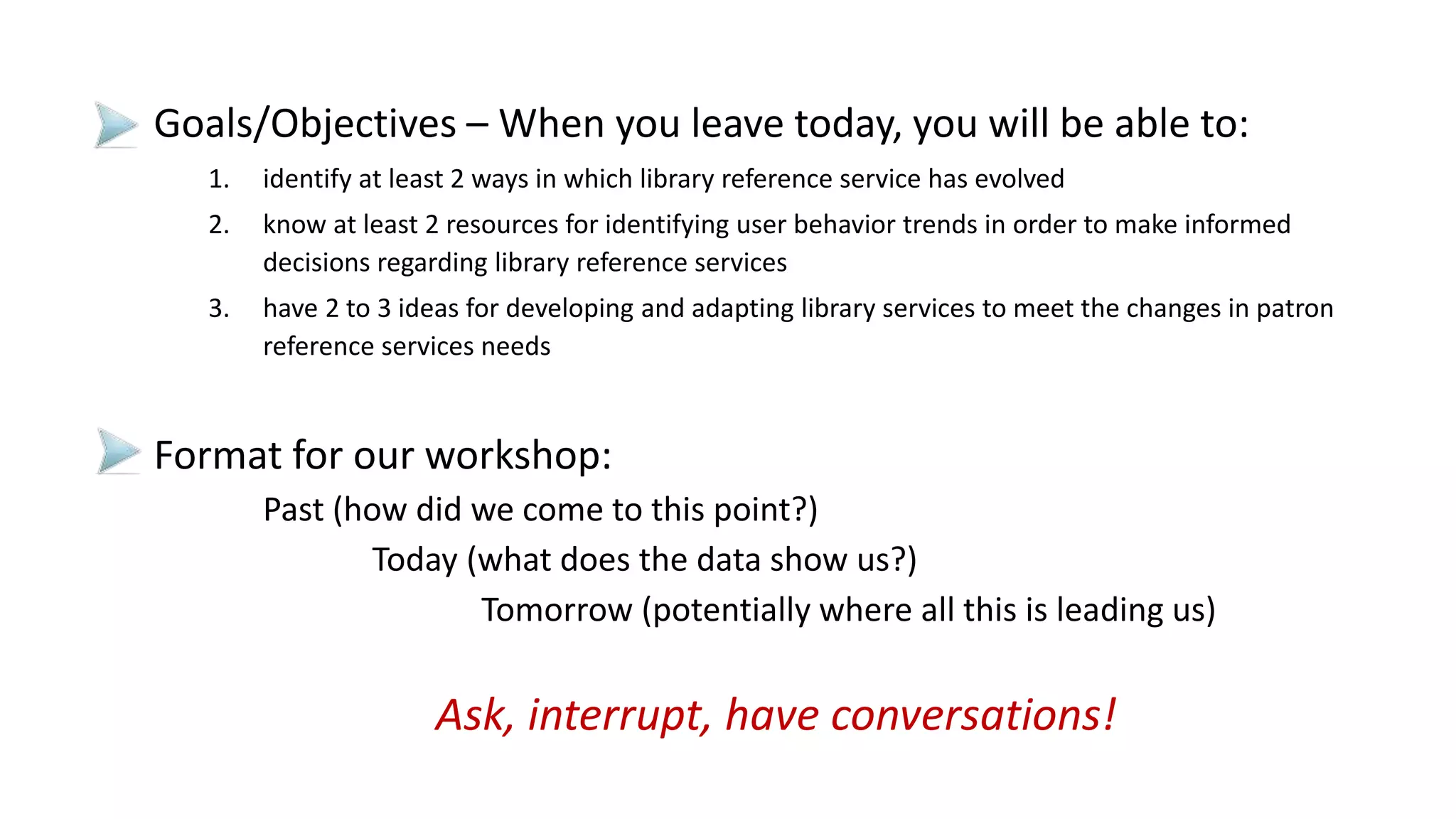 The document outlines a workshop presented at the Maryland and Delaware Library Association conference that focused on the evolution and future of library reference services. It identifies key historical milestones, challenges faced by reference services today, and encourages attendees to engage in discussions about adapting to changing patron needs. Participants are expected to leave with strategies for understanding user behavior and improving reference services in their libraries.
