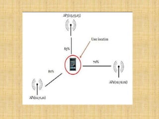 This document discusses and compares different indoor positioning techniques, focusing on Wi-Fi positioning. It describes how Wi-Fi positioning works by measuring the received signal strength from multiple access points and triangulating the user's position. Specifically, it presents an algorithm that uses the distances calculated from the signal strengths received from three access points to determine the coordinates of the user's location. The document also mentions using Dijkstra's algorithm for shortest path routing of indoor navigation once a user's position is determined.