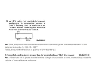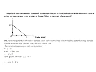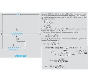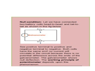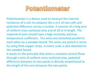 A potentiometer measures the internal resistance of a cell, compares e.m.f. of cells, and potential difference across a resistor using a long wire of uniform cross-section. It operates on the principle that potential difference is directly proportional to wire length under constant current. The document discusses construction, working, calibration, comparisons of e.m.f., determination of internal resistance, and includes problem-solving scenarios involving a potentiometer setup.