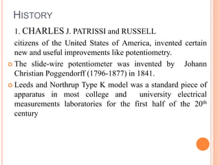 The document provides a comprehensive overview of potentiometry, detailing its historical development, methods, and applications in electroanalytical chemistry. It explains the principle of measuring potential differences between electrodes, various types of electrodes used (including reference and indicator electrodes), and different forms of titration techniques. Additionally, it discusses the applications of potentiometry across multiple industries including environmental monitoring, pharmaceuticals, and food quality analysis.