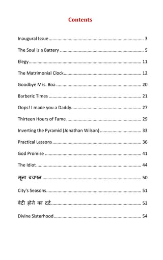 This document contains the table of contents for an online magazine called Pothiz published by Pothi.com. It lists 14 short stories, poems and articles. The document also includes an introductory note from the publisher welcoming readers to the inaugural issue and highlighting some of the featured entries.