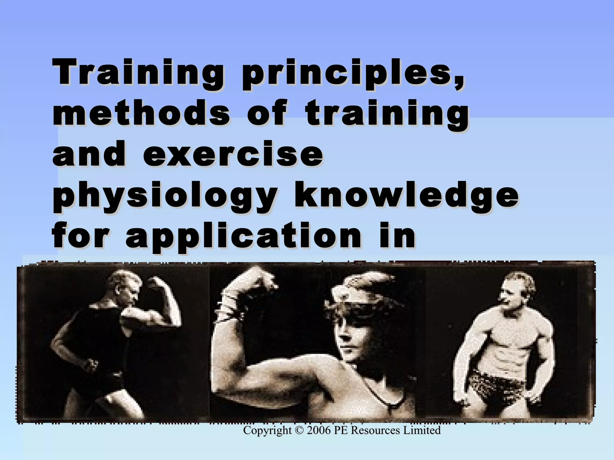 This document provides an overview of training principles, methods of training, and exercise physiology knowledge for physical activity. It discusses key topics including training principles like specificity, progression, and overload/adaptation. Health and skill-related components of fitness are outlined, such as cardiorespiratory endurance, muscular strength, and agility. The three main energy systems - ATP-PC, anaerobic glycolysis, and aerobic - are described in relation to exercise intensity and duration. Examples are given of how different activities utilize varying proportions of the energy systems.