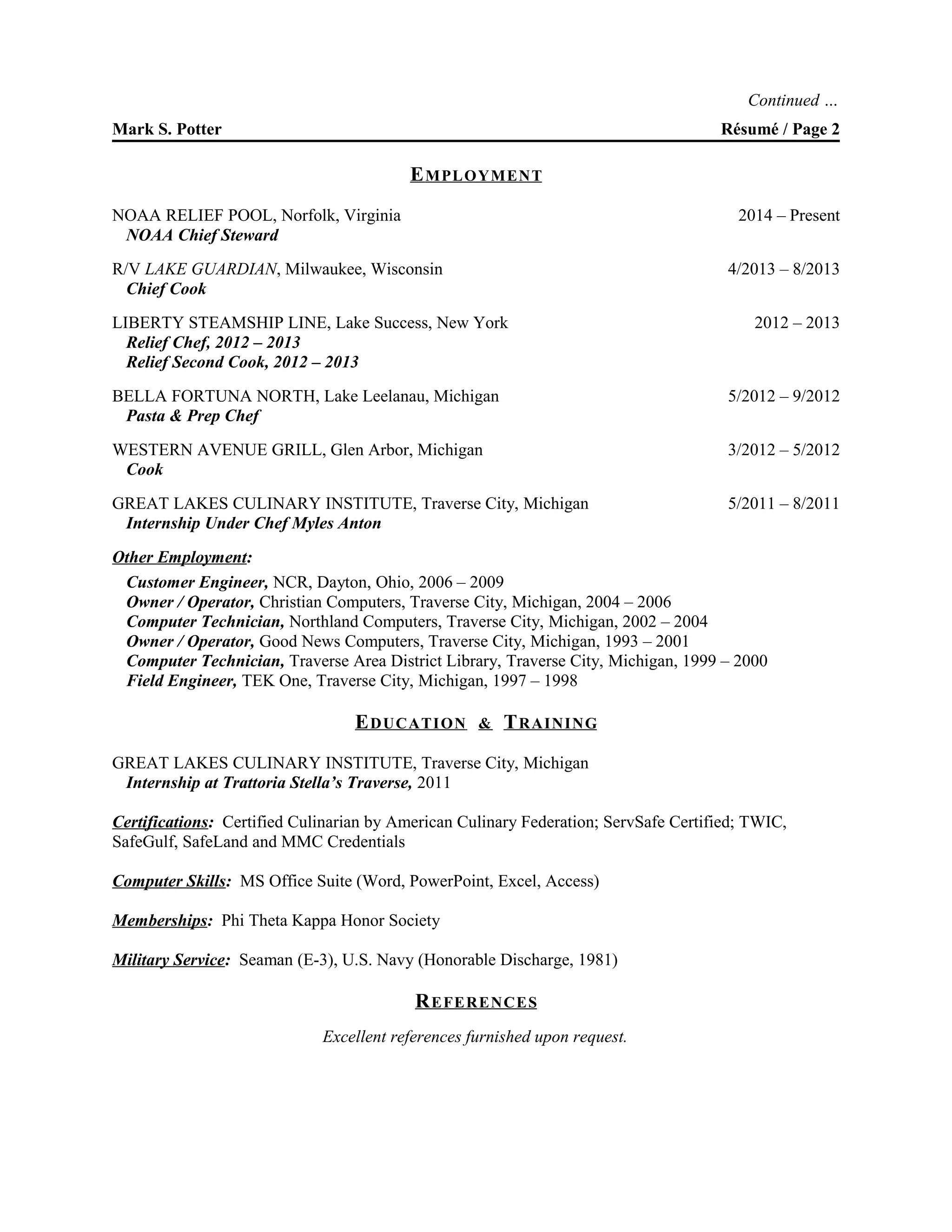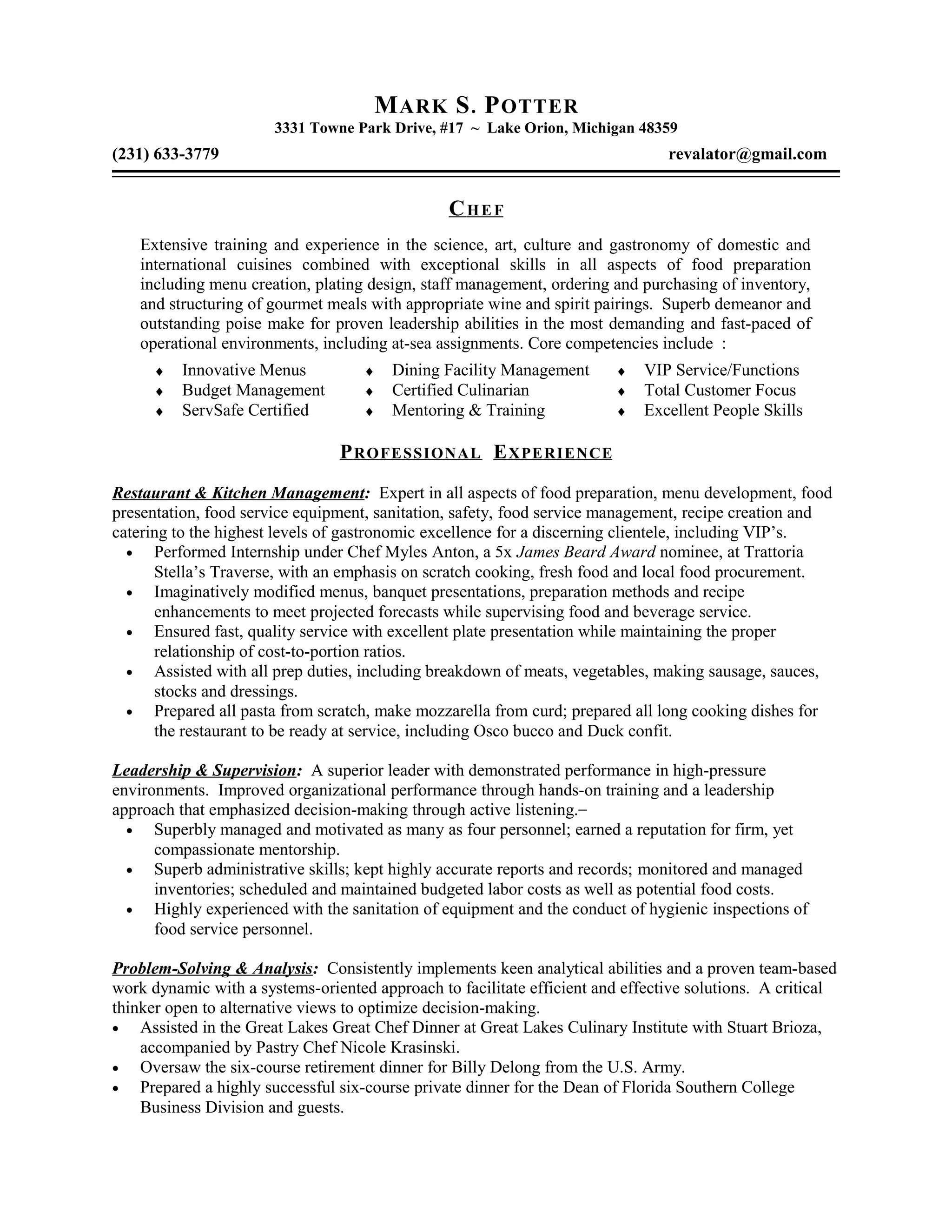 Mark Potter has extensive experience in restaurant and kitchen management, food preparation, menu development, and culinary leadership. He has worked as a chief cook on research vessels, relief chef on steamships, and pasta/prep chef at restaurants. Potter completed an internship under renowned chef Myles Anton at Trattoria Stella's Traverse, focusing on scratch cooking and local sourcing. He is certified in culinary arts and food safety standards, and possesses strong computer, budgeting, and inventory management skills from over 15 years of professional culinary experience.
