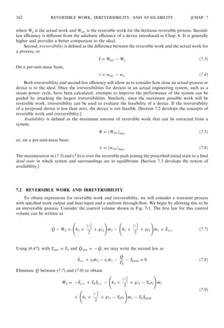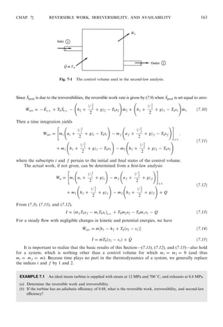 This document discusses reversible work, irreversibility, and availability in thermodynamics. It defines reversible work as the maximum possible work for a process, calculated by assuming the process is reversible with no entropy production. Irreversibility is defined as the difference between reversible and actual work. Availability is the maximum reversible work that can be extracted from a system as it moves to equilibrium with its surroundings. The document provides equations for calculating reversible work, irreversibility, and availability. It also introduces exergy as a measure analogous to availability. Several examples apply these concepts to problems involving turbines, compressors, and nozzles.