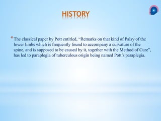 This document provides information on spinal tuberculosis, including its history, types of lesions, clinical presentation, imaging findings, treatment, and indications for surgery. It discusses how spinal tuberculosis is usually secondary to a primary infection elsewhere in the body that spreads hematogenously to the spine. The most common type of spinal lesion is a paradiscal lesion that begins in the vertebral body. Clinical presentation varies from asymptomatic to paraplegia. Imaging like CT and MRI are useful to identify bone destruction and abscesses. Treatment involves anti-tuberculosis medications for 18 months along with rest. Surgery is indicated for neurological deterioration, advanced disease, or diagnostic uncertainty.