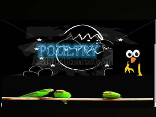 This document discusses different types of poultry including chickens, turkeys, ducks, and game birds. It defines several poultry terms related to chicken production, including broiler, layer, pullet, capon, spent hen, rooster, and cockerel. Broilers are chickens raised for meat that are typically slaughtered at 6-7 weeks when they weigh around 4 pounds, while layers are female chickens raised for egg production that can lay up to 300 eggs per year.