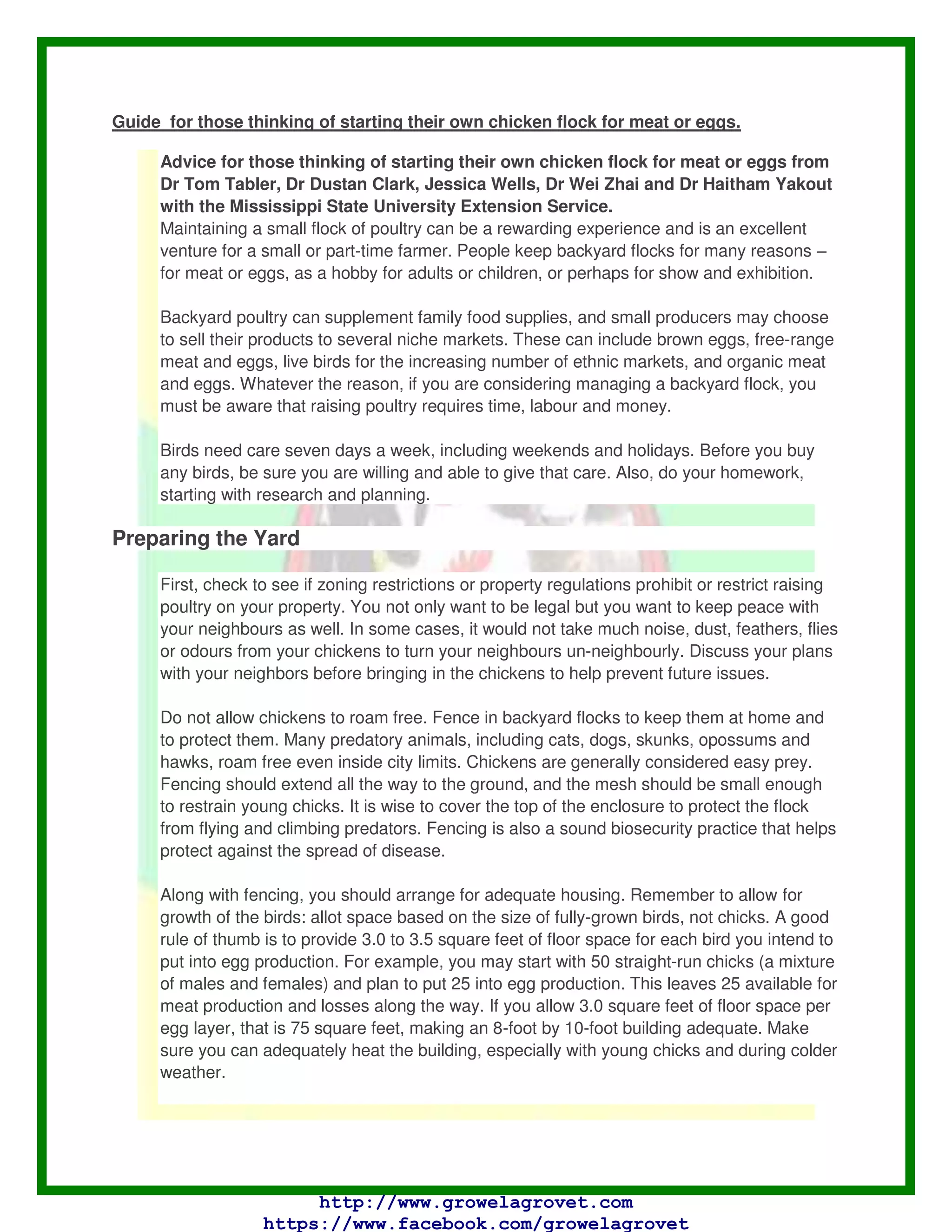 This document provides a guide for those interested in starting a backyard chicken flock for eggs or meat. It outlines important considerations like zoning restrictions, preparing the yard with adequate fencing and housing, purchasing chicks or adult birds, feeding and caring for the flock, and maintaining health. Key responsibilities include giving daily care, preventing disease through biosecurity measures, and understanding the long-term commitment of raising poultry. With proper planning and care, a backyard flock can be a rewarding experience for the family.