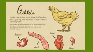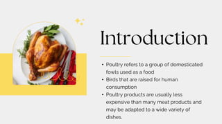 This document provides information on various types of poultry including chicken, turkey, duck, goose, pigeon, and their nutritional composition and cuts. It discusses how poultry quality is judged based on color and odor. The different processing stages are outlined from live to packaged forms. Methods for preparing poultry include trussing, seasoning, and stuffing. Poultry meat consists mainly of protein and water with varying amounts of light and dark meat depending on the species.