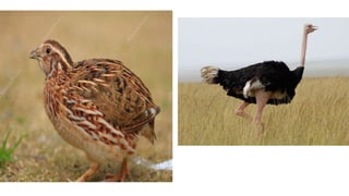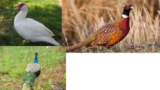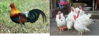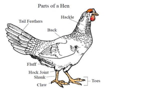This document discusses the classification and types of poultry. It begins by outlining the zoological classification of poultry from kingdom to species. It then provides examples of common poultry types including their classification and characteristics. Finally, it describes several popular chicken breeds, focusing on their traits, uses, and standard weights.