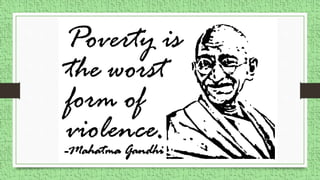 Poverty is defined as a situation where one lacks adequate resources or means of livelihood. It can be experienced individually but commonly involves feelings of powerlessness and lack of access to resources. Poverty has several dimensions such as lack of livelihood strategies, inability to maintain social relations due to lack of resources, feelings of insecurity and frustration. Theories of poverty include Malthus' theory that overpopulation is the main cause and Marx's theory that exploitation of workers by capitalists leads to poverty. Causes of poverty include sickness, unemployment, poor income, natural disasters, and unequal distribution of resources while impacts include malnutrition, child labor, crime, and failure to develop socially. Addressing poverty involves social welfare programs, employment