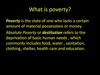 Poverty is defined as a lack of basic human needs like food, water, shelter, and healthcare. It means lacking the ability to participate effectively in society due to not having opportunities, choices, or access to resources. Extreme poverty is living on less than $1.25 per day, which affects one's health, security, and inclusion in their community. Effects of poverty include increased risk of water-borne diseases and malnutrition, especially in sub-Saharan Africa, as poverty limits access to clean water and adequate nutrition.
