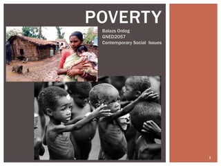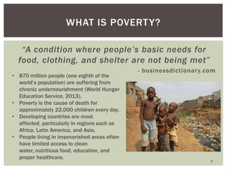The document discusses poverty globally and in specific regions and countries. It begins by defining poverty and providing statistics on its global prevalence. It then examines poverty levels and causes in developing countries, Haiti, Africa, and the United States. Several charitable organizations that provide aid to reduce poverty are also mentioned. Theories like conflict theory and structural functionalism are used to explain causes and functions of poverty in societies.