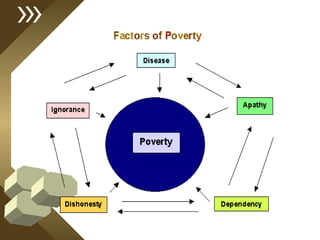 The document discusses poverty in India and globally. It notes that poverty is caused by factors like dependence on primitive agriculture, high population growth, natural disasters, corruption, lack of access to education, and socioeconomic inequalities. Some key statistics provided include that almost half the world lives on less than $2.50 a day, nearly a billion people entered the 21st century unable to read, and 1 billion children live in poverty globally. The effects of poverty mentioned are increased crimes, exploitation of the poor, high population growth, illiteracy, inequality, and migration.