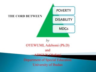 The document discusses how persons with disabilities have largely been left out of efforts to achieve the Millennium Development Goals. While some goals have led to improvements, the targets do not specifically address the needs of persons with disabilities in places like sub-Saharan Africa and South Asia. As a result, individuals with disabilities are among the poorest members of society with little means of survival. The document calls for disability issues to be more fully incorporated into development strategies and notes that the inherent flaws of only focusing on averages risks leaving the world's most marginalized populations, including those with disabilities, behind.