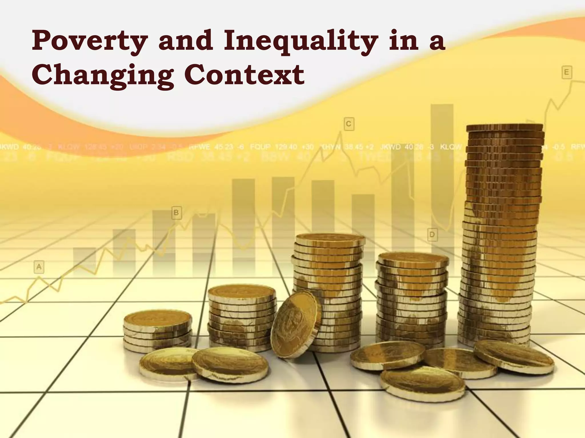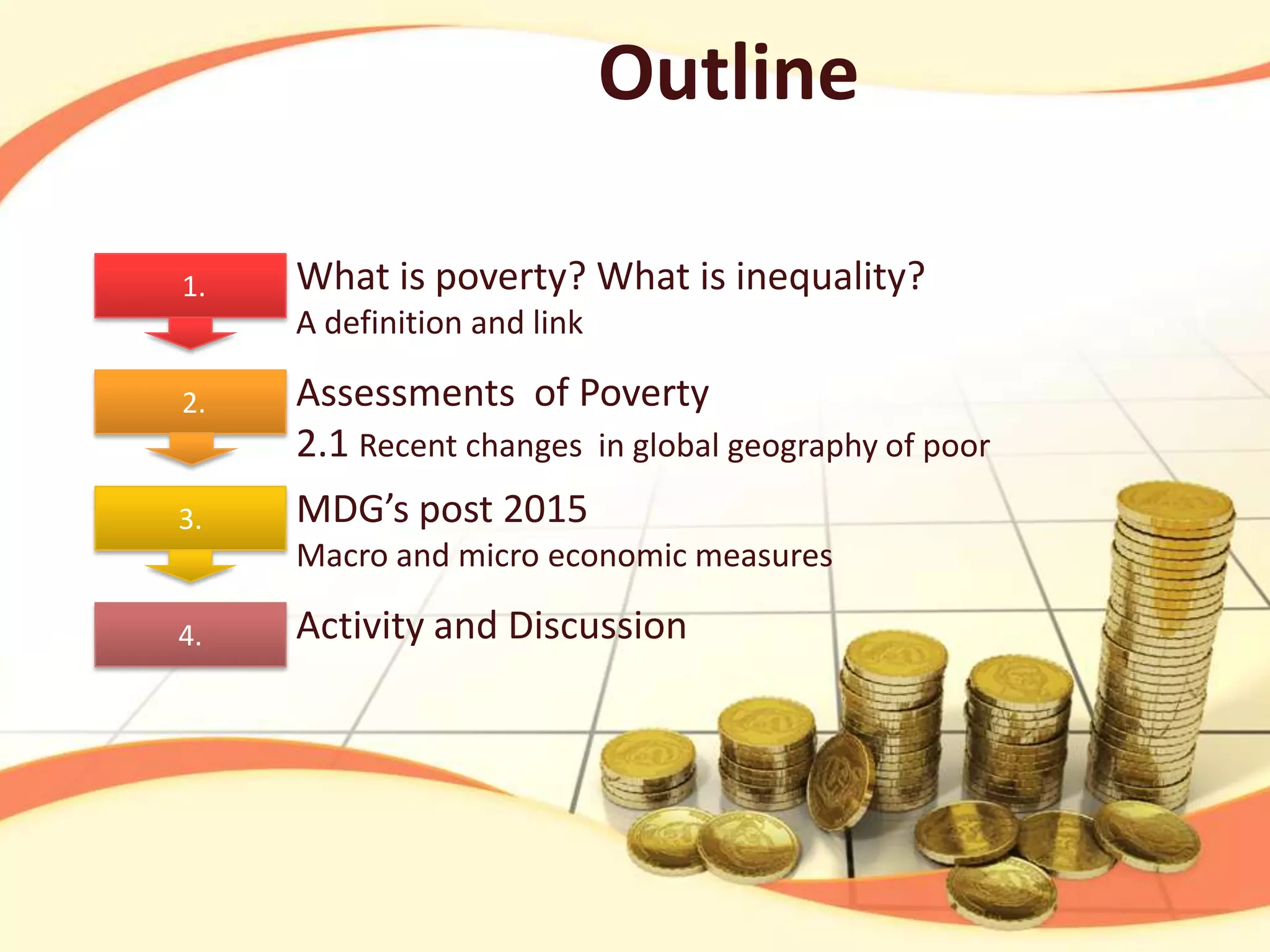 This document outlines poverty, inequality, and the Millennium Development Goals (MDGs). It defines poverty in monetary, capability, and participatory terms. It discusses measuring poverty through monetary indicators like consumption, capability indicators like health and education, and inequality indicators like income distribution. It notes most of the world's poor now live in middle-income countries rather than low-income countries. The document then outlines the MDGs on eradicating poverty, improving health, education, gender equality, and the environment. It discusses options for a post-2015 framework, including both macroeconomic approaches like foreign aid and microeconomic approaches like employment creation and public services. It proposes evaluating the MDGs from different perspectives and discourses.