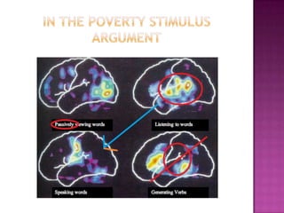 We all begin with a universal grammar that encodes language parameters set by environmental data exposure. Acquiring a language involves systematically mapping sounds to meanings. Plato's problem, or the gap between knowledge and experience, refers to how humans can know more than just what they experience according to Noam Chomsky.