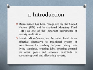 This document compares traditional and Islamic microfinance approaches to poverty alleviation. It discusses how Islamic microfinance is based on Islamic principles of avoiding interest and ensuring fairness. Key Islamic microfinance tools discussed are zakat, which requires charity for the poor, and waqf, where wealth is contributed for public benefit. The document argues that by sharing risks and ensuring equity, Islamic microfinance can more effectively help the poor compared to traditional interest-based microloans.