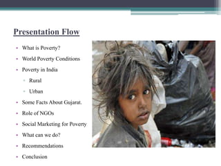 This document provides an overview of poverty in India, including key statistics and information. It discusses that over 27.5% of India's population lives below the poverty line, with 75% living in rural areas. Rural poverty is caused by factors like rapid population growth, lack of capital, illiteracy, and lack of job opportunities outside of agriculture. The document also addresses urban poverty in India and government initiatives to address employment, housing, and other issues. It concludes by emphasizing the need to continue efforts to alleviate poverty in India.