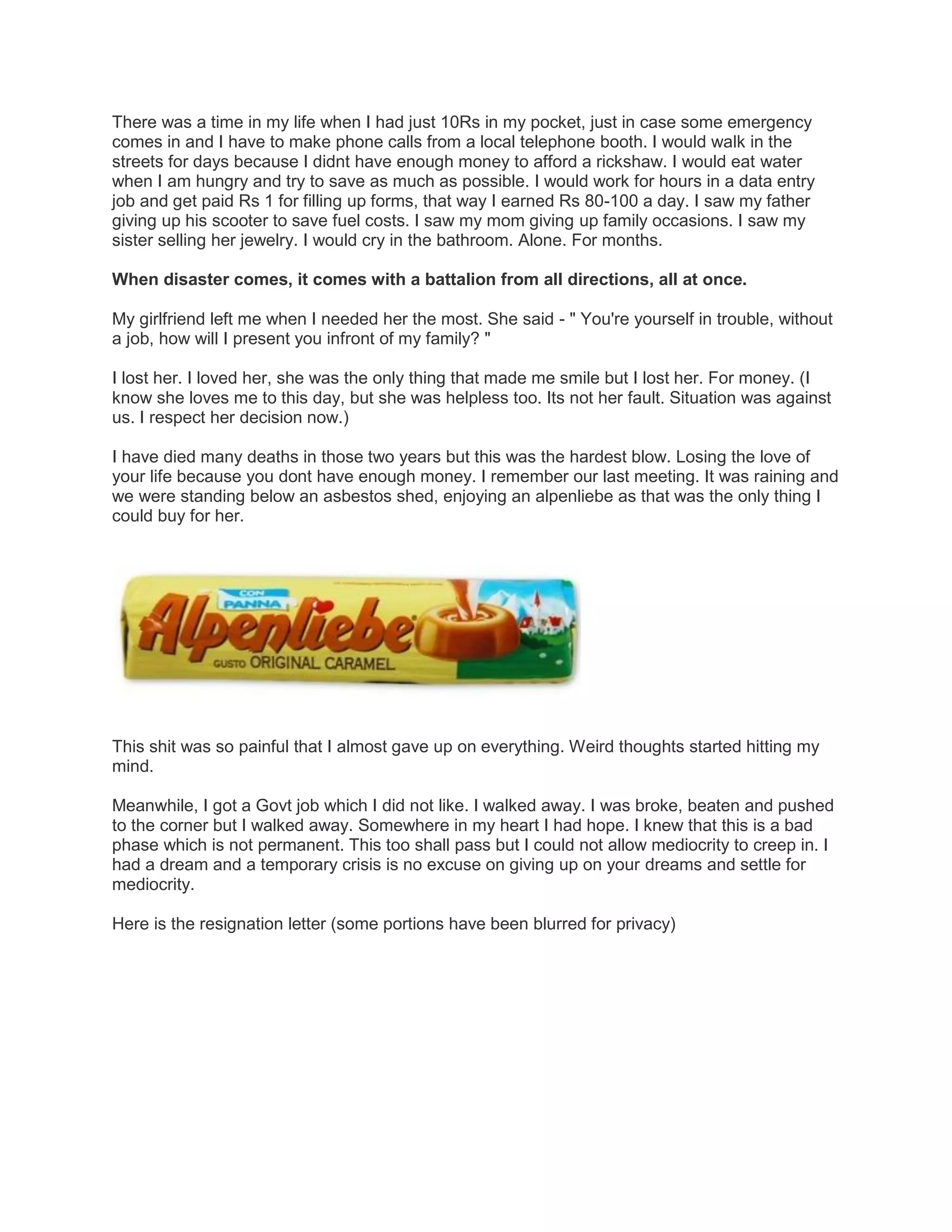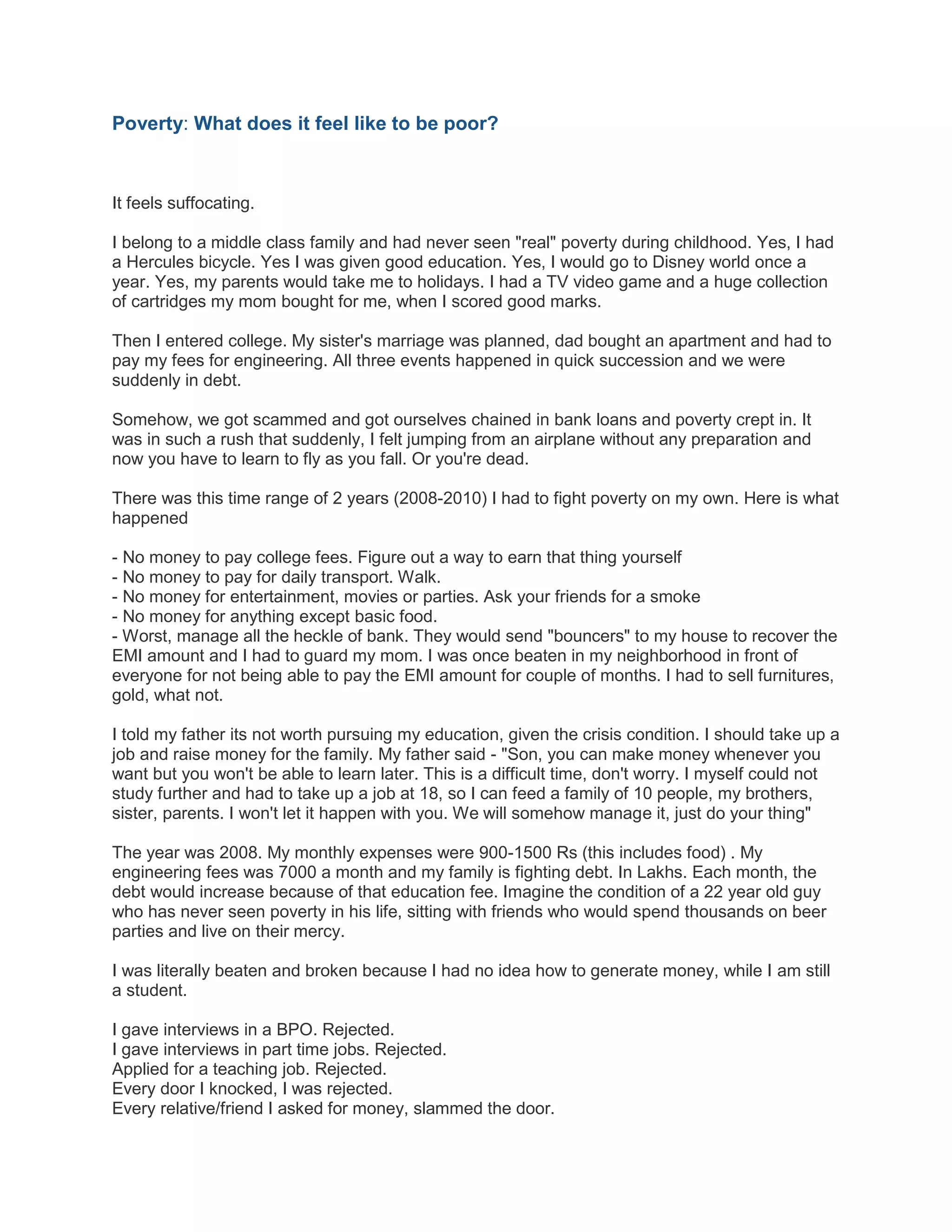 The document describes the author's experience with poverty during college. For 2 years, the author struggled financially as their family faced debt. The author could not afford college fees, transportation, or entertainment. They tried many jobs but were rejected. They eventually started a website business with 700 rupees and generated 40,000 rupees over 2 years, paying off debts. The author shares lessons learned, including not comparing yourself to others, taking risks, and helping others in need.