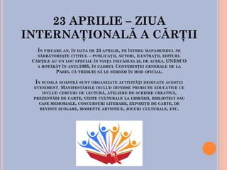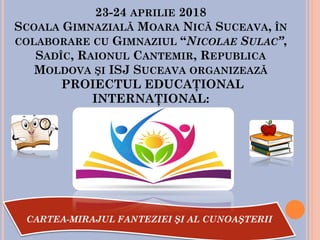 Proiectul educațional internațional organizat de școala gimnazială Moara Nică și alte instituții vizează celebrarea zilei internaționale a cărții prin activități diverse, precum cercuri de lectură și ateliere de scriere creativă. Elevii sunt încurajați să exploreze universul cărților și să împărtășească experiențele lor prin lecturi și activități culturale. Scopul acestui demers este de a stimula cunoașterea și creativitatea, promovând importanța cărții în viața tinerilor.