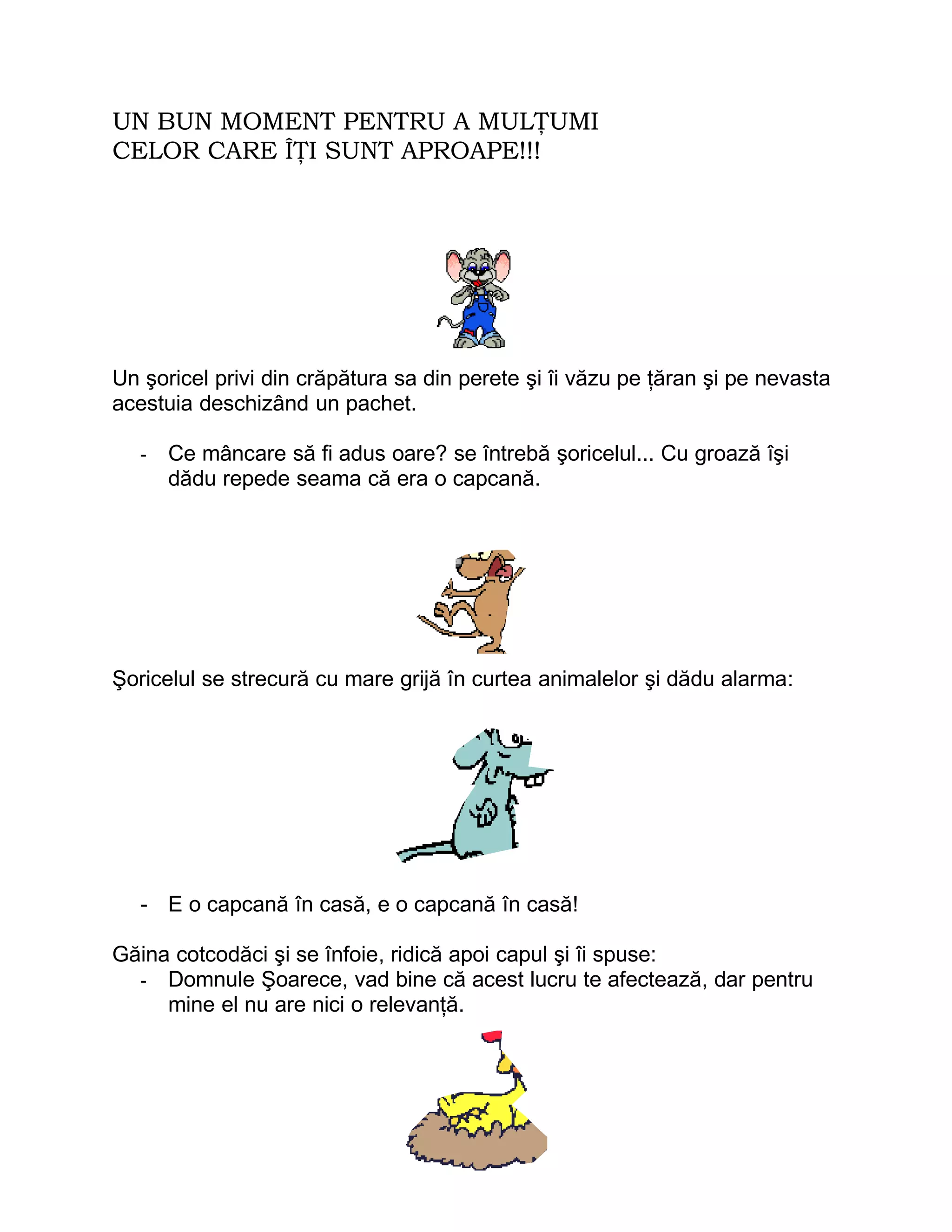 Un șoricel observă o capcană în casă și încearcă să alerteze animalele din curte despre pericolul acesteia, dar primește răspunsuri indiferențe. În cele din urmă, nevasta țăranului care nu a luat în serios avertismentul este mușcată de un șarpe veninos, ceea ce duce la moartea ei și la sacrificarea animalelor din curte pentru a hrăni participanții la înmormântare. Povestea subliniază interconexiunea între indivizi și importanța responsabilității reciproce în comunitate.