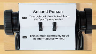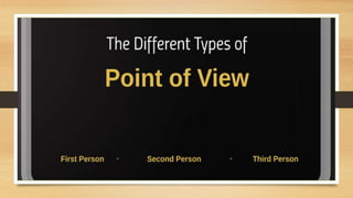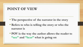 Point of view refers to the perspective from which a story is told. There are four main points of view: first person, where the narrator is a main character; second person, where the reader is inserted into the story; and third person, which can be either limited to one character's thoughts or omniscient, allowing access to all characters' perspectives. The point of view affects how the reader views and understands the events in the story.