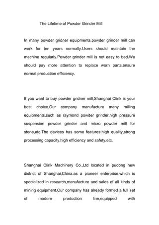 Powder grinder mills can normally work for ten years if maintained regularly by replacing worn parts to ensure normal production efficiency. Shanghai Clirik is a manufacturer of powder grinder mills and other mining equipment located in Shanghai, China that offers high quality, high capacity, and efficient machines for customers. Interested customers should contact Sunshine Lan at Shanghai Clirik for more details on powder grinder mills.