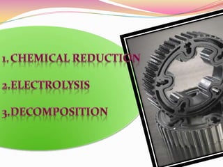 Chemical reduction is a common process for producing metal powders that involves reducing metal oxides, carbonates, or nitrates at temperatures below the metal's melting point. This results in a reduced product that is then crushed and ground into a powder. Some advantages are that it is simple, flexible, and an only method for producing powders of metals like molybdenum and tungsten. Electrolytic processing involves electrolysis where a metal deposits as a powder on cathode plates in an electrolytic tank. The deposited powder is then scraped off and pulverized. Decomposition involves breaking down organic substances into simpler forms, and is used for producing iron and nickel powders where decomposition sintering requires less temperature than