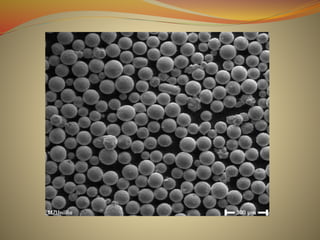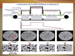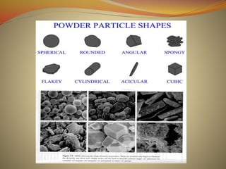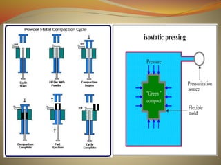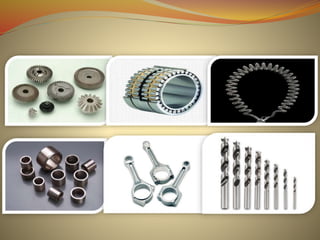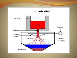 Powder metallurgy is a process that involves producing metal powders, mixing them with additives, compacting them into a desired shape, and then sintering the compact to fuse the particles together. Metal powders are commonly produced via atomization, which involves breaking liquid metal into fine droplets. The powders are then mixed with lubricants or binders before being compacted under high pressure. The compacted "green" part is then sintered at a temperature below melting to bond the particles and increase strength without melting. Final products may require additional machining. Powder metallurgy allows for complex shapes and compositions with reduced machining compared to other metalworking methods.
