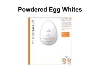 The document discusses powdered egg whites and details the certifications achieved by a company involved in egg powder production. It includes information on how to buy egg white powder and provides contact information for the company.