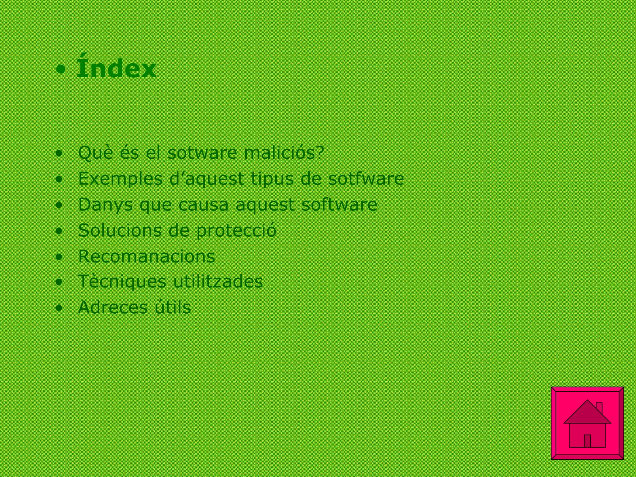 Índex Què ésel sotware maliciós? Exemples d’aquest tipus de sotfware Danys que causa aquest software Solucions de protecció Recomanacions Tècniques utilitzades Adreces útils
