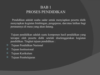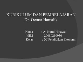 Dokumen tersebut membahas tentang kurikulum dan pembelajaran. Ia menjelaskan bahwa pendidikan bertujuan untuk menyiapkan peserta didik, dan kurikulum terdiri dari tujuan, materi, metode, organisasi, dan evaluasi. Pembelajaran merupakan proses untuk mencapai tujuan pendidikan melalui interaksi antara guru dan siswa dengan memperhatikan motivasi dan pendekatan seperti CBSA. Evaluasi diperlukan untuk mengukur