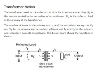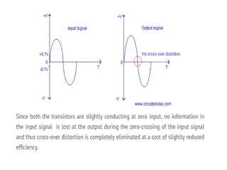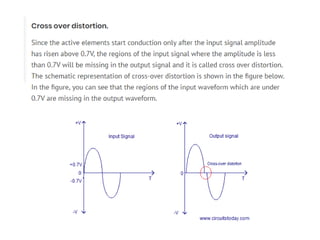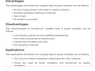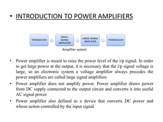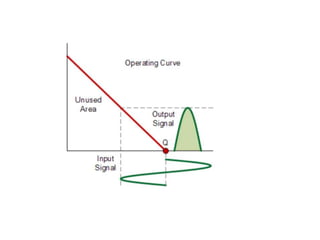 Class A amplifiers have the highest linearity because the transistor is always conducting. They are the least efficient at 30% due to continuous power loss. Class B amplifiers only conduct for half of the signal cycle, improving efficiency to 50% but introducing crossover distortion. Class AB balances efficiency and distortion by conducting more than half but less than the full cycle. Class C amplifiers have the greatest efficiency of 80% but introduce heavy distortion as they conduct for less than half of the input cycle. They are used for radio frequency amplification rather than audio.