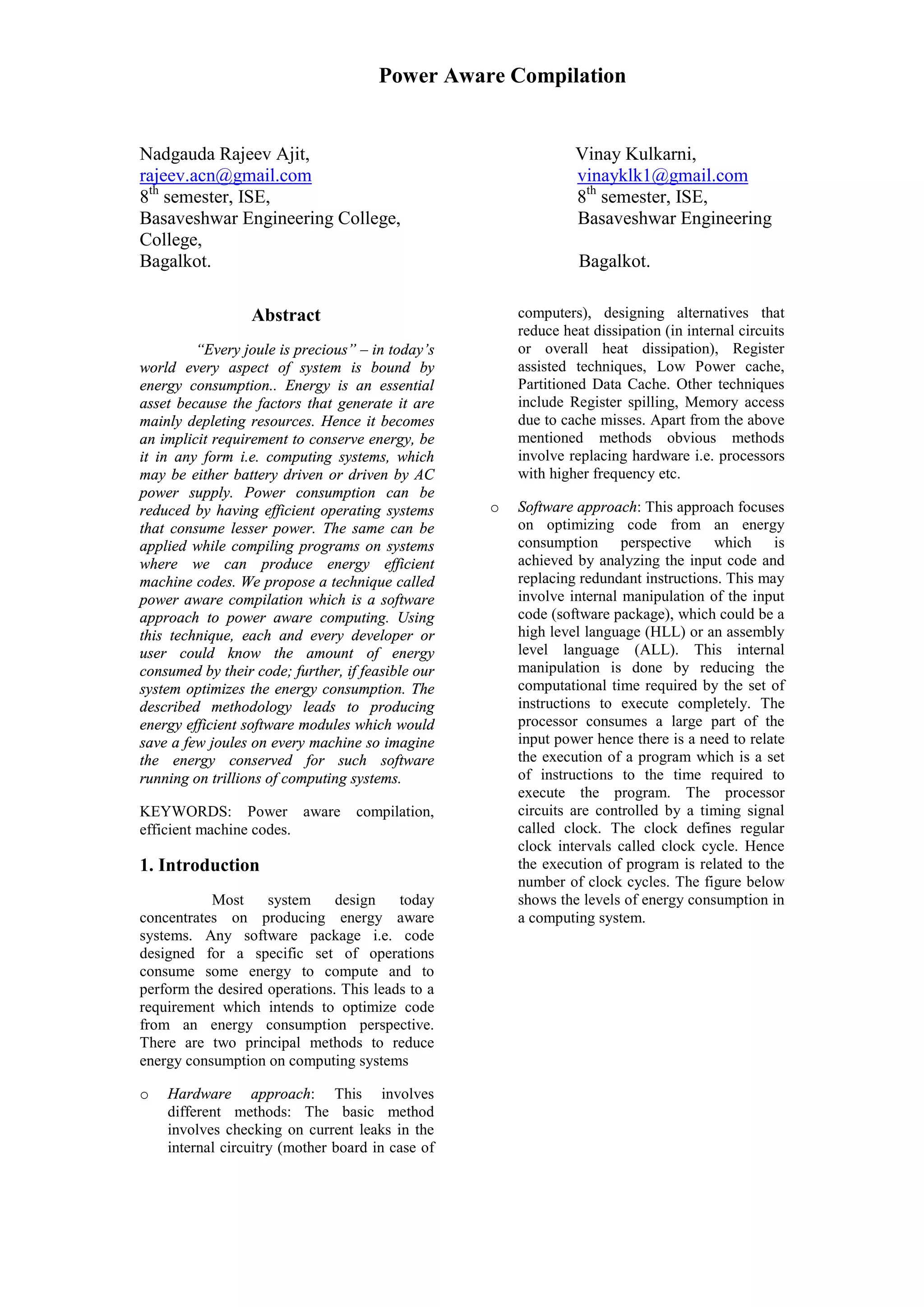 Power aware compilation is a software approach to reducing energy consumption by optimizing code during compilation. It works by [1] analyzing assembly code produced during compilation to calculate clock cycles needed for execution, [2] developing optimization models to replace instructions with equivalents needing fewer cycles, and [3] generating optimized assembly code requiring less energy to run. This technique aims to make developers aware of programs' energy efficiency and influence more energy-conscious software development.