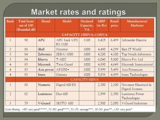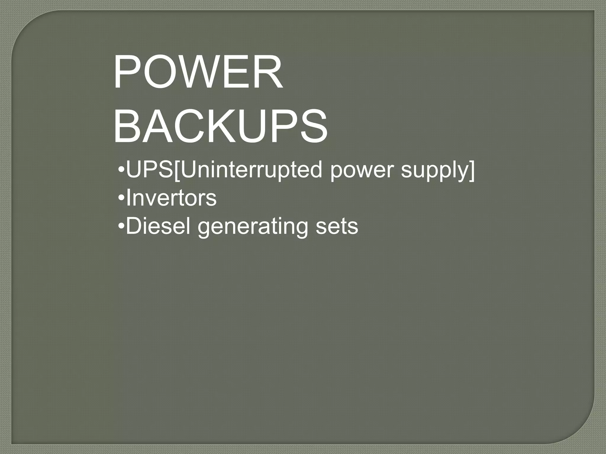 The document provides an overview of various power backup systems including UPS (Uninterruptible Power Supply), inverters, and diesel generators, detailing their functions, uses, advantages, disadvantages, types, and maintenance requirements. It outlines the importance of power backups in critical environments like hospitals and data centers to ensure continuity of operations during power outages. Additionally, it describes specific products from leading brands and highlights installation considerations and site-specific observations.