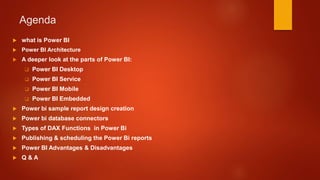 Power BI is a Microsoft business analytics service that allows users to create reports and dashboards without relying on developers. The presentation covers various aspects of Power BI, including its architecture, components like Power BI desktop and mobile, as well as DAX functions and report publishing. Advantages include ease of use and advanced visualizations, while disadvantages involve sharing limitations and certain UI issues in slicers.