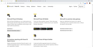 The document outlines the author's experience as a software engineer with four years in Power BI, detailing components like Power BI Desktop, Service, Gateway, and Mobile. It explains the functionalities of each component, including report creation, sharing, and data request processes. Additionally, it provides download links and resources for further learning about the Power BI ecosystem.