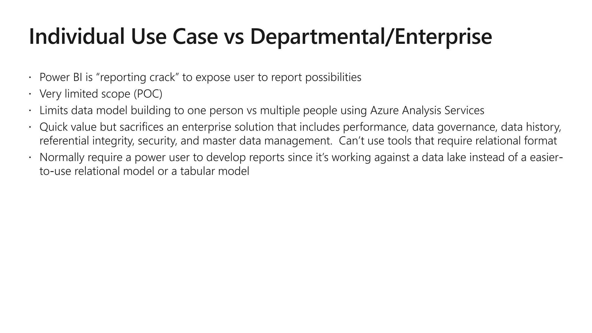 New features in Power BI give it enterprise tools, but that does not mean it automatically creates an enterprise solution. In this talk we will cover these new features (composite models, aggregations tables, dataflow) as well as Azure Data Lake Store Gen2, and describe the use cases and products of an individual, departmental, and enterprise big data solution. We will also talk about why a data warehouse and cubes still should be part of an enterprise solution, and how a data lake should be organized.