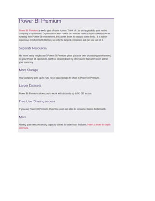 Power BI is a cloud-based business intelligence tool that allows users to perform data visualization and reporting through a self-service interface. It consists of various components such as Power BI Desktop for data modeling, Power BI Service for report sharing, and Power BI Mobile for access on the go. The document also covers data preparation, ETL processes, data analytics, and the differences between OLTP and OLAP systems, along with the use of DAX for calculations and creating reports.