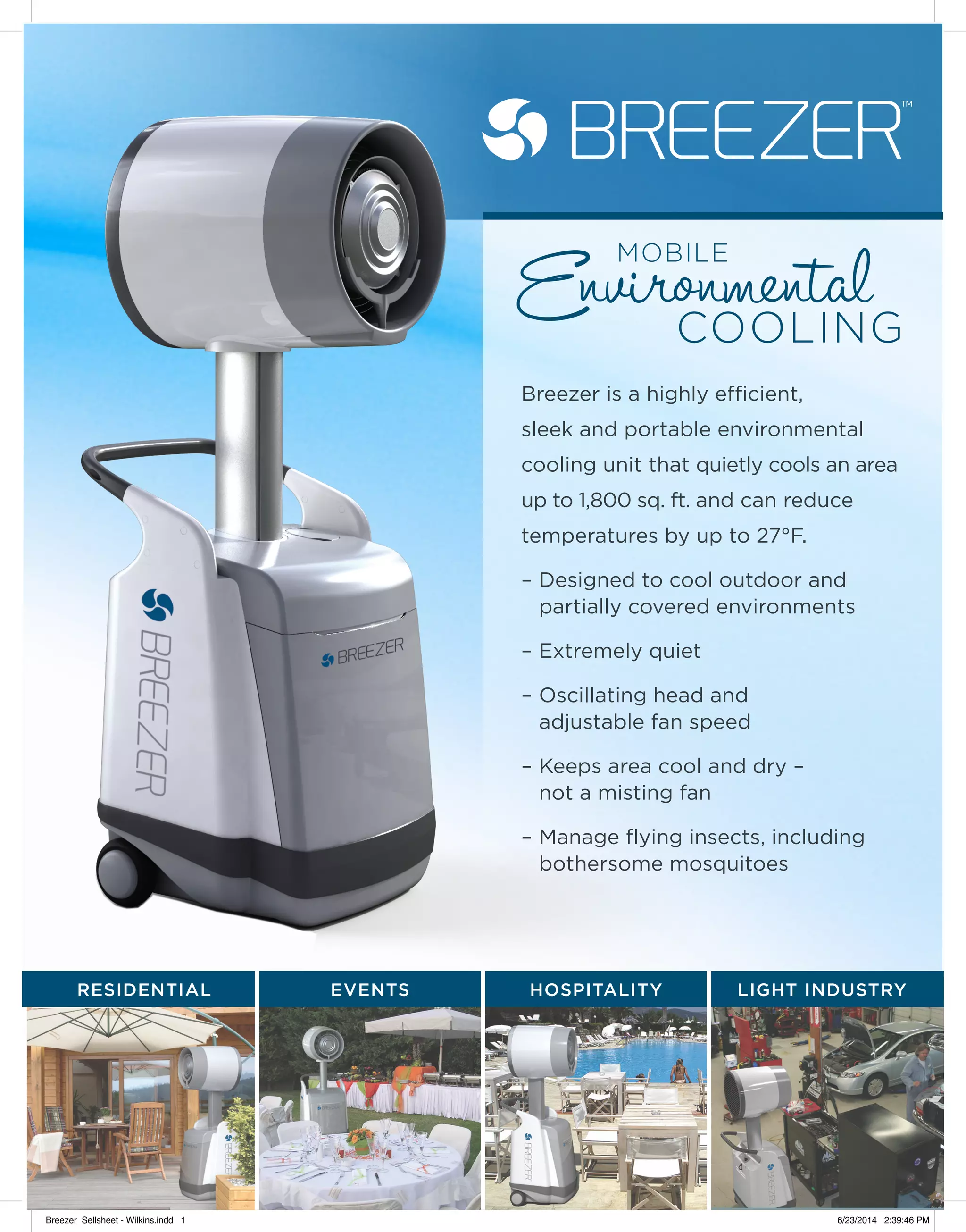 Breezer is a portable environmental cooling unit that effectively cools areas up to 1,800 sq. ft. with a temperature reduction of up to 27°F. It features an attractive design, minimal maintenance requirements, and can be used in various outdoor settings such as hotels, sporting events, and construction sites. The unit is equipped with an oscillating head, adjustable fan speed, and an easy-to-fill 20-gallon reservoir for extended cooling.