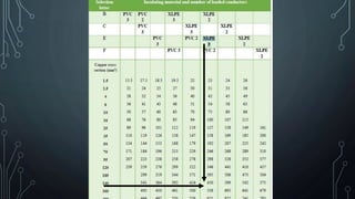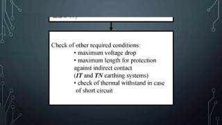 The document outlines the methodology for selecting power cables, emphasizing important properties such as flexibility, load capacity, and safety. It details specifications regarding voltage classes, insulation types, installation methods, and design calculations including maximum design current and voltage drop considerations. A supporting example is provided, demonstrating calculations to determine appropriate cable cross-section based on various factors including ambient temperature and installation conditions.