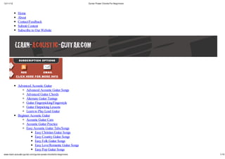 The document discusses power chords for beginner guitar players. It explains that power chords only contain the 1st and 5th notes of a scale rather than a full chord. Charts show the finger positioning for a variety of power chords compared to full chords. Video lessons demonstrate how to play power chords. The article encourages learners to also study full chords.