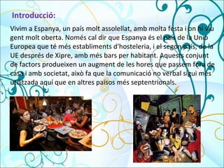Vivim a Espanya,un país molt assolellat, amb molta festa i on hi viu gent molt oberta. Només cal dir que Espanya és el país de la Unió Europea que té més establiments d'hosteleria, i el segon país, de la UE després de Xipre, amb més bars per habitant. Aquests conjunt de factors produeixen un augment de les hores que passem fora de casa i amb societat, això fa que la comunicació no verbal sigui més utilitzada aquí que en altres països més septentrionals. Introducció: