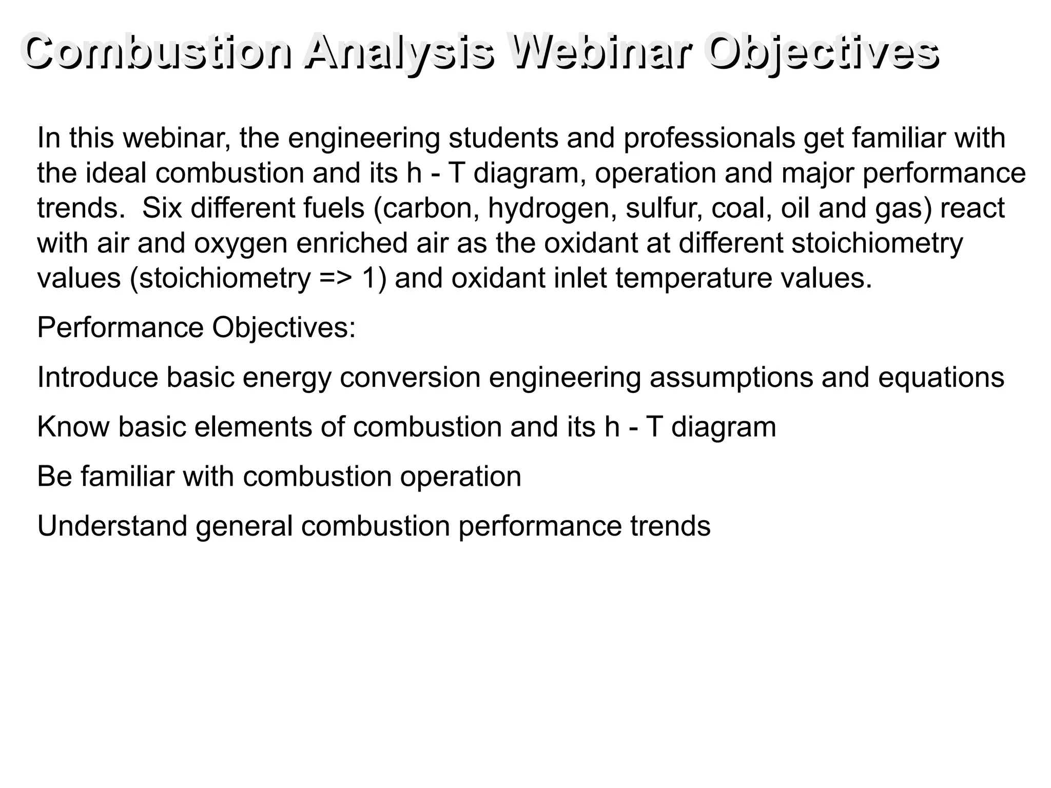 The document outlines a combustion analysis webinar aimed at engineering students and professionals, focusing on ideal combustion processes involving six different fuels (carbon, hydrogen, sulfur, coal, oil, and gas) and their reactions with air and oxygen under various conditions. Key objectives include understanding basic combustion principles, performance trends, and relevant engineering equations. The analysis includes thermodynamic properties, stoichiometric calculations, and detailed graphs illustrating combustion processes.