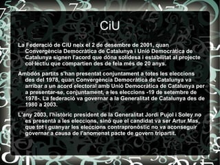 CiU La Federacióde CiU neix el 2 de desembre de 2001, quan Convergència Democràtica de Catalunya i Unió Democràtica de Catalunya signen l'acord que dóna solidesa i estabilitat al projecte col·lectiu que compartien des de feia més de 20 anys.