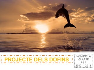The document describes a classroom project about dolphins. The students in class P5A voted to name their class "Els Dofins" (The Dolphins). They then discussed what they know about dolphins based on their own experiences. Some of the things mentioned include how dolphins jump, swim fast, play with balls, breathe under water, eat fish, and live with whales. The students listed additional things they wanted to learn about dolphins. They planned how to decorate their classroom door and welcome a new dolphin puppet mascot. An index was made of topics to research dolphins further.