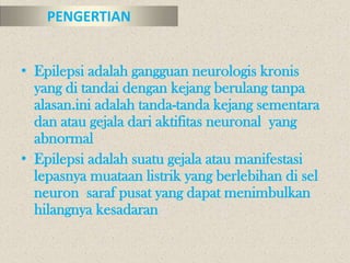 Epilepsi adalah gangguan neurologis kronis yang ditandai dengan kejang berulang akibat aktivasi abnormal sel neuron. Etiologi epilepsi dapat meliputi faktor idiopatik, trauma, tumor, stroke, dan infeksi. Penanganan meliputi pemberian obat antikejang dan tindakan pencegahan untuk menghindari cedera selama kejang.
