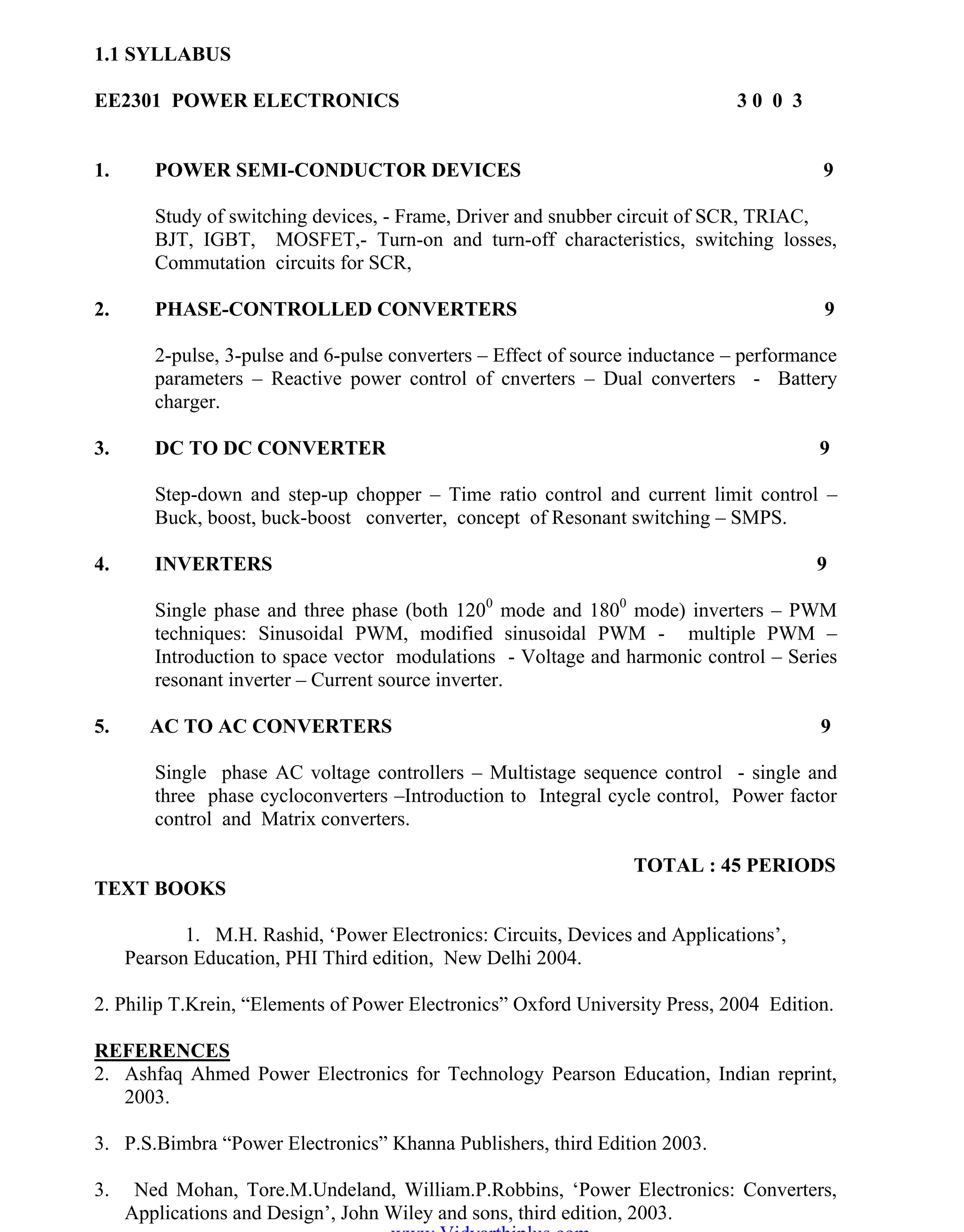 The document provides details about the syllabus for the course EE2301 Power Electronics. It includes 5 units: