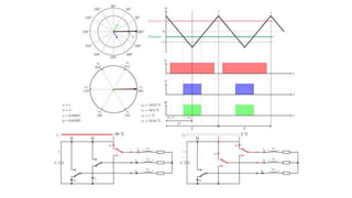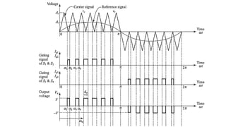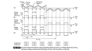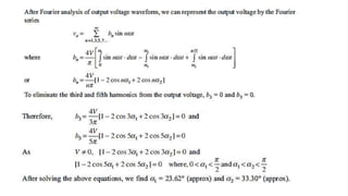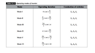 The document discusses inverters, which are static devices that convert DC power into AC power, detailing their applications, classifications, and types including current source and voltage source inverters. It also explains various circuit configurations and commutation methods, as well as operational modes for single-phase and three-phase inverters. Additionally, it covers voltage control methods for inverters, highlighting external and internal control techniques to achieve desired output voltages.
