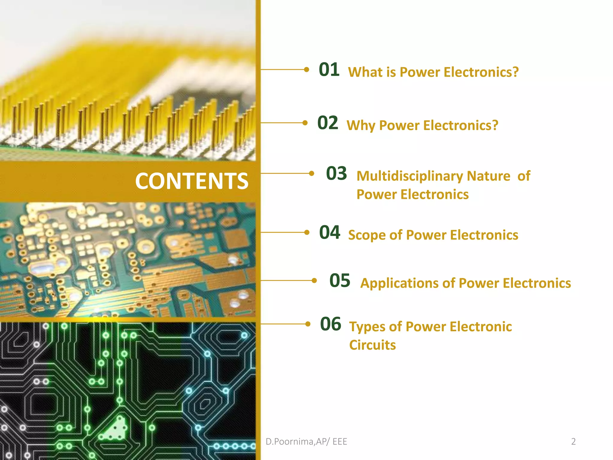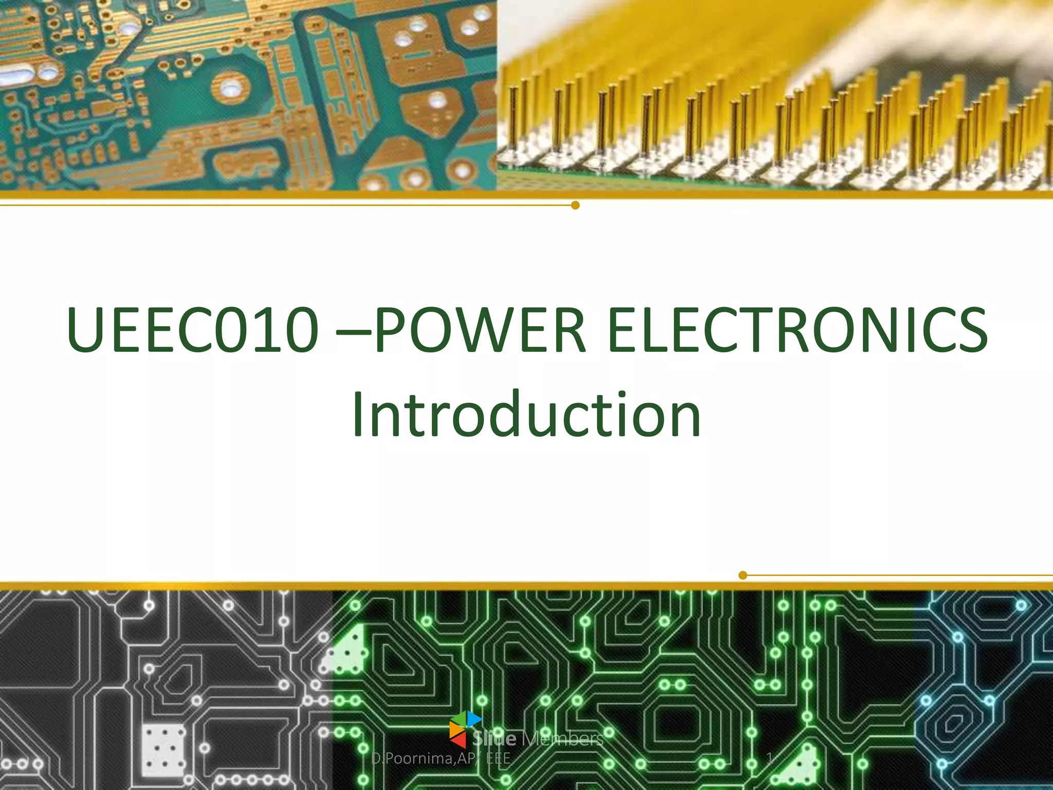 This document provides an introduction to power electronics. It defines power electronics as the technology associated with efficient conversion and control of electric power using power semiconductor devices. The future of global society will be dominated by computers and power electronics, with the former providing intelligence and the latter providing the means. Power electronics has many applications and is multidisciplinary, drawing from fields like signal processing, electronics, electromagnetics, and control theory. It describes the types of power electronic circuits like rectifiers, converters, choppers, inverters, and AC-AC converters. Power devices are also classified based on the number of terminals, charge carriers, and degree of controllability.